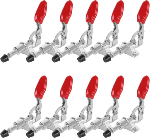 Paquete de 10 abrazaderas de palanca: modelo GH-301AM, ángulo de apertura de mango de 190 grados, capacidad de sujeción: 99 libras/99.2 lbs; carrera del émbolo: 0.630 in/0.6 pulgadas. 3 composiciones resistentes: esta abrazadera de palanca de liberación rápida consta de una placa base de brida para instalar la abrazadera de palanca firmemente, punta de presión de goma ajustable para una sujeción flexible y mango ergonómico de plástico acanalado para un funcionamiento seguro y cómodo. Materiales sólidos: hecho de acero al carbono laminado en frío galvanizado que resiste la corrosión, se utiliza durante más tiempo. Ideal para sujetar plantilla: ideal para soldar, moldear, plantilla de ensamblador para sierras de mesa, cajas de gabinete o mesas de enrutador, accesorios, ensamblajes y bases móviles.
