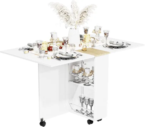 Mesa de comedor que ahorra espacio: la mesa de comedor plegable es un mueble elegante y versátil diseñado para satisfacer el estilo de vida de los urbanitas modernos. Ya sea que necesites trabajar, estudiar, jugar o disfrutar de una comida desde casa, la mesa plegable puede proporcionarte el espacio y la funcionalidad que necesitas. Es una opción ideal, especialmente para aquellos que viven en un pequeño apartamento o suite. Mesa de comedor plegable multifuncional: el tamaño de la mesa de comedor plegable desplegada es de 52.7 pulgadas de ancho x 31.5 pulgadas de profundidad x 30 pulgadas de alto, y puede acomodar fácilmente a 4 personas. La mesa de comedor plegable mide 31.5 pulgadas de ancho x 30.1 pulgadas de profundidad x 30 pulgadas de alto cuando se despliega en un lado. En este modo, se puede usar fácilmente para trabajar, estudiar, coser. El tamaño de la mesa de comedor plegable es de 7.5 pulgadas de ancho x 31.5 pulgadas de profundidad x 30.1 pulgadas de alto cuando está plegada, es pequeña y fácil de almacenar, y también se puede utilizar para mesas de entrada y mesas de sofá. Diseño práctico: la mesa plegable móvil también tiene seis ruedas giratorias de 360 grados, cuatro de ellas se pueden bloquear para un fácil movimiento y fijación en cualquier momento. En la parte frontal de la mesa hay un cajón y un armario para guardar vinos y vajillas, con un soporte extraíble para botellas, para que sus pertenencias se puedan almacenar en un lugar específico para su comodidad. En la parte posterior, hay armarios de almacenamiento de doble capa con marco de metal anticaída, que son suficientes para satisfacer tus necesidades de almacenamiento y hacer que tu hogar sea más ordenado y ordenado. Resistente y estable: la mesa de comedor plegable está compuesta de madera de alta calidad, que es duradera, fácil de limpiar y tiene una larga vida útil. Ya sea en casa o en la oficina, puede adaptarse a diferentes entornos, satisfacer tus necesidades y hacer tu vida más fácil. Experiencia feliz: el paquete de la mesa de comedor plegable incluye instrucciones detalladas (idioma español no garantizado) y números de pieza para guiarte a través del proceso de montaje de forma clara y cómoda. Para tu disfrute de las compras, ofrecemos productos de alta calidad y un servicio al cliente considerado. No dudes en ponerte en contacto con nosotros si tienes alguna pieza perdida o dañada durante el transporte, o cualquier problema en el montaje.