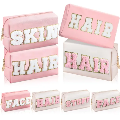 Características: Buena mano de obra: La bolsa de cara viene con parches de letras brillantes, los monogramas están hechos de exquisito bordado y tela no tejida, cosida en la bolsa firmemente. No tienes que preocuparte de que se caigan. Expresa tu amor: Esta bolsa de maquillaje con parche de letras de chenilla es bonita, brillante y atractiva. A las niñas y las mujeres les gustará. Envíalo a tu esposa, hermana, amante, familia, hija y compañera de trabajo para expresar tu amor. Especificaciones: Material principal: cuero de la PU Color: beige y rosa. Tamaño: aproximadamente 9.84 x 5.12 x 2.8 pulgadas/9.8 x 5.1 x 2.8 in El paquete incluye: 8 bolsas de maquillaje. Nota: Medición manual, puede haber ligeras diferencias en el tamaño. El color puede variar ligeramente debido a las diferentes pantallas.