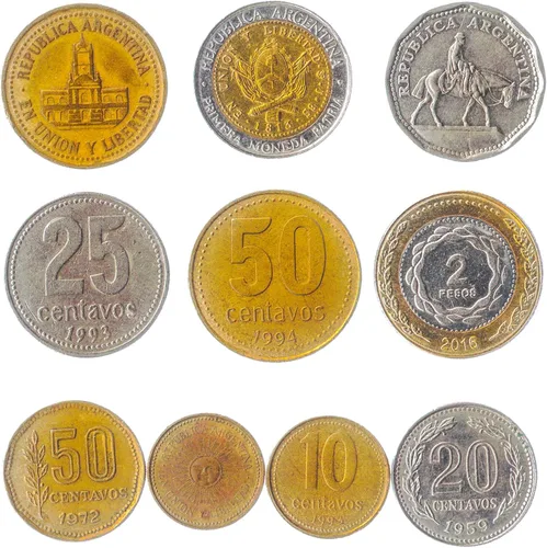 10 Monedas de Novedad Mixta de Argentina (República Argentina, República Argentina). Diferentes monedas de fantasía argentinas fueron elegidas al azar desde 1954. El producto puede ser ligeramente diferente de las fotos. Cada producto puede tener diferentes combinaciones de monedas de recuerdo y números de catálogo únicos. Las monedas novedosas pueden tener arañazos, suciedad o daños por oxidación. Composiciones: Cobre-níquel, acero chapado en cobre, acero recubierto de níquel, acero chapado en cobre-níquel, acero niquelado, acero recubierto de níquel, acero recubierto de cobre-níquel, aluminio-magnesio, aluminio, aluminio-bronce, latón, acero recubierto de latón, acero chapado en latón, Tipo bimetálico: Peso mixto: 56 g. Forma: Redonda Las monedas de novedad pueden tener imágenes y símbolos: - Temas: Animales, Edificios, Retratos - Animales: Aves, Hornero Rufo, Rhea Común, Pumas, Guacamayos - Edificios: Palacio del Congreso Nacional Argentino (Parlamento), Antiguo Cabildo de Buenos Aires, Casa Histórica de Tucumán, Estatua de "El Resero" (un hombre montando un caballo) - Barcos y Naves: Barcos de vela Otra información interesante: El Sol de Mayo es una referencia a la Revolución de Mayo en Argentina, que condujo a la independencia de ese país del dominio español