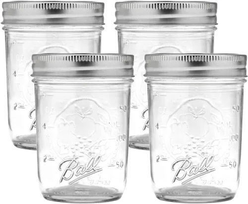 Ball - Tarros de vidrio Mason de boca regular con tapas y bandas, usados para enlatado (media pinta, 8 onzas (paquete de 4))