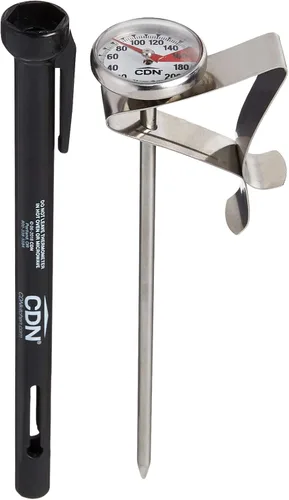 Esfera magnificada de 2.5 cm / 1 pulgada Tallo de 5 pulgadas perfecto para jarras de espuma pequeñas Incluye clip de acero inoxidable ajustable, clip de bolsillo y herramienta de recalibración en la funda Rango de medición: 0 a 220 F