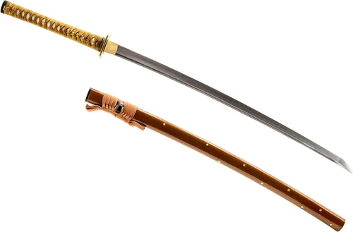 Espada Katana Samurai japonesa de calidad 1045 totalmente hecha a mano Guerrero y Fuji tsuba, espiga completa, borde afilado y funcional Hoja de aproximadamente 28.5 pulgadas, mango de 11 pulgadas y 41 pulgadas en total Mango de madera envuelto w/ray piel y cordón de algodón marrón con Menuki Madera lacada piano marrón con Sageo marrón