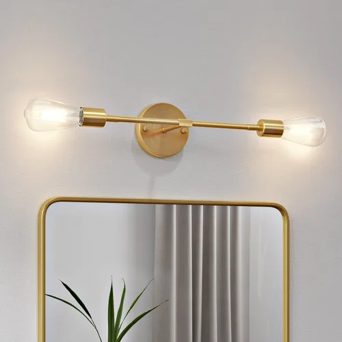 【APLIQUE DE PARED O LUZ DE TECHO】La moderna lámpara de tocador dorada de 2 luces para baño está construida en un tamaño delicado (4.72 pulgadas de profundidad y 16.7 pulgadas de largo), se puede instalar en tu pared con diferentes ángulos en posición vertical u horizontal para tu baño, tocador, cocina, pasillo o iluminación de espejo, también se puede instalar en el techo para iluminar cualquier área maravillosamente. Ideal como iluminación de tocador de baño, luces de pared de pasillo, apliques de pared para dormitorio o tocador. 【ESTILO DE MEDIADOS DE SIGLO Y MATERIAL RESISTENTE】La lámpara de baño está hecha de metal resistente y resistente en acabado dorado de latón cepillado, que es impermeable y antioxidante y corrosión, durabilidad de alta retención de color, súper fácil de limpiar, simple pero elegante, ideal para interiores como un aplique de baño, una luz de tocador de granja, mesita de noche de dormitorio, tocador, sala de estar, exposición y galería pronto. 【REQUISITOS DE BOMBILLA】Los apliques de pared industriales dorados tienen enchufes estándar E26, compatibles con bombillas LED, CFL y halógenas (Máx. 60W, Bombilla NO Incluida), pueden ser regulables con bombillas regulables e interruptor. Además, con su diseño abierto para iluminación de 360°, estas luces de pared emitirán elegantes luces brillantes para tu espacio. ¡Decora tu habitación con las luces de tocador de 2 luces! Instalación rápida y fácil: todos los accesorios necesarios para el procesamiento de la instalación están incluidos en el paquete, lo que necesitas hacer es conectar el cable que solo tarda 5 minutos en completarse y obtener hermosos apliques de iluminación de pared. Cableado permanentemente, no tiene interruptor. Servicio al cliente: la lámpara de pared interior está bien hecha y cuenta con certificación UL, es ideal para que tu familia lo use sin preocupaciones. Si tienes algún problema con nuestro aplique dorado de pared, resolveremos tus problemas en 24 horas.