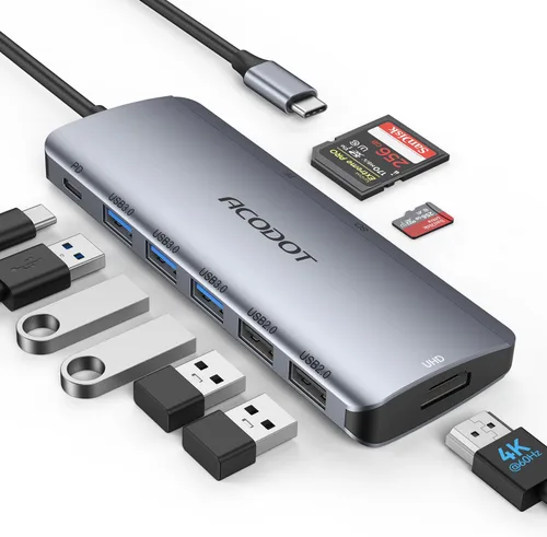 🍀[Concentrador USB-C 9 en 1] El adaptador multipuerto USB-C Hub de Acodot expande un solo puerto USB-C a 9 puertos (1 * HDMI 4K@60HZ, 3 * USB 3.0, 2 * USB 2.0, 1 * carga PD, 1 * ranura para tarjeta TF, 1 * ranura para tarjeta SD). Plug and Play, no requiere software, controladores ni instalación complicada. 🖥️ [4K@60Hz HDMI UHD Display] Duplica o extiende tu pantalla con el puerto HDMI a TV HD, monitor o proyector. Compatibilidad con resolución 4K@60Hz (compatible de forma descendente con 2K@60Hz, 1080p, 1080i, 720p, 480p, SOLO cuando tus dispositivos sean compatibles con resolución 4K, la salida de video será 4K.) 🏂[𝟓 PUERTOS USB & LECTOR DE TARJETAS SD/TF] El adaptador multipuerto tipo c hub de Acodot ofrece 3 puertos USB 3.0 para una transmisión rápida (supervelocidad con transferencia de datos de hasta 5 Gbps). Solo toma unos segundos transferir fotos o videos a su computadora portátil. 📱[Amplia compatibilidad] El dongle USB-C de Acodot es compatible con casi todos los dispositivos USB-C y Thunderbolt 3, como MacBook Pro, iMac/iMac Pro, iPad Pro, Google Chromebook Pixel, Huawei MateBook Pro, Dell, Surface Book2, Lenovo, Samsung y muchos otros portátiles tipo C/USB C (SÓLO DP1.4). Nota: El puerto C del teléfono móvil debe ser compatible con USB 3.1 tipo C y modo DPALT. 🏃 ♂️[Máximo de 100W de entrega de potencia] El puerto de entrega de potencia del adaptador de hub USB C multipuerto admite hasta 100W para mantener su MacBook Pro u otro portátil compatible. Garantía sin preocupaciones de 12 meses, si encuentras algún problema, por favor ponte en contacto con nosotros a través del Centro de Mensajes de Amazon, y recibirás asistencia en un plazo de 6 horas.