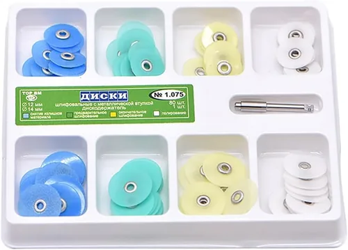 Discos de Pulido Kit Universal conector metálico (80 uds./pack) Los discos con cuatro tipos de capa abrasiva son efectivos para el acabado y pulido de restauraciones compuestas, incluidos los rellenos ubicados como área proximal. El paquete incluye: (80 piezas) Reducción bruta 20Pcs Contorno 20 piezas Acabado 20 piezas Pulido 20 piezas con 1 mandril de PC