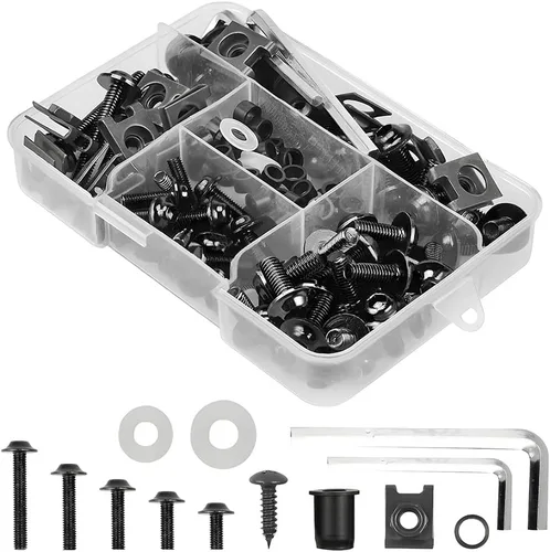 Detalles técnicos: Tamaño: 5.6 x 3.9 x 1.2 pulgadas Peso del artículo: 11.3 onzas Color: negro, azul, dorado, verde, rojo, plata, púrpura, naranja, color titanio El paquete incluye: Total: 177 unidades Tornillos M6 (M6 x 40 mm) x 5 20 tornillos M6 (M6 x 16 mm) Tornillos M6 (M6 x 20 mm) x 20 Pernos M5 (M5 x 16 mm) x 20 Tornillos M5 (M5 x 25 mm) x 8 Tornillos de armadura (4.8*20mm) x 4 Clips de velocidad x 14 Arandelas M6 x 20 Arandelas M5 x 20 Pilar de plástico M6 x 20 Pilar de plástico M5 x 20 Tuercas de goma M5 x 4 2 llaves inglesas ¿Por qué elegirnos? 1. Calidad - Hecho de aluminio de alta calidad que es resistente al óxido, resistente a la corrosión. 2. Cantidad - 177 piezas en total, cantidad suficiente para tu motocicleta. 3. Talla - Diseñado en tamaño estándar, básicamente adecuado para la mayoría de motocicletas.
