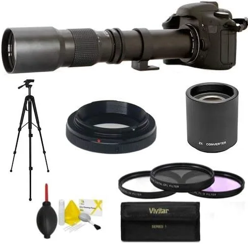 ESTA TELEFOTO LENTE TE PERMITIRÁ TOMAR FOTOS DE OBJETOS A 200 YARDS ADELANTE Lente teleobjetivo refractor acromático de 19.685 in 2x Teleconvertidor duplica la potencia de su lente a 39.370 in. Cristal óptico HD de alto índice y baja dispersión con recubrimiento múltiple para reducir el resplandor. Cuello de trípode integrado para mejorar la lente. El kit de equilibrio incluye un súper teleobjetivo preestablecido de 19.685 in, 2 duplicadores, montaje en T, filtros 3HD, trípode PRO de 50 pulgadas, removedor de polvo de soplador de aire, kit de limpieza profesional de 7 piezas