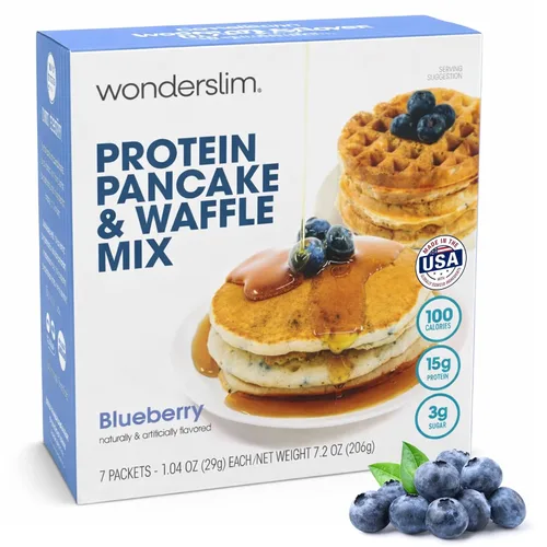 Mezcla para panqueques y waffles de proteínas WonderSlim, sabor a arándano, baja en azúcar y calorías (7 unidades)