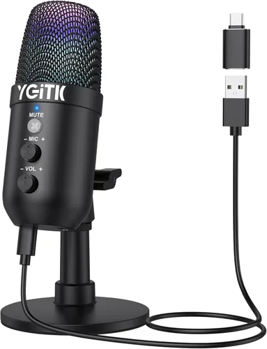 Iluminación RGB inmersiva: el micrófono USB cuenta con una iluminación RGB dinámica que cicla automáticamente a través de colores vibrantes mientras está en uso, añadiendo un efecto visual fresco y envolvente a tu configuración de juegos o transmisión. La iluminación se vuelve roja cuando está silenciada, por lo que es fácil saber cuándo estás en vivo o en pausa Sonido de calidad de transmisión profesional: equipado con un micrófono de condensador cardioide, este micrófono captura un sonido claro y de rango completo directamente desde la parte delantera mientras rechaza el ruido de fondo de los lados y la parte trasera. Con una frecuencia de muestreo de 48 KHz/16 bits y SNR de 85 dB, tu voz siempre llegará a través de voz alta, clara y nítida Silencio de un solo toque y cancelación inteligente de ruido: el botón de silencio de un solo toque te permite silenciar rápidamente tu micrófono cuando sea necesario, mientras que el botón inteligente de cancelación de ruido filtra sonidos no deseados como clics del teclado, ruido del ventilador y zumbido de habitación, asegurando que tu voz se mantenga clara incluso en entornos ruidosos Monitoreo de latencia cero y control de ganancia: conecta tus auriculares a través del conector de 0.138 in para monitoreo de audio en tiempo real con latencia cero. Ajusta la perilla de control de ganancia para ajustar la sensibilidad del micrófono, para que capte la cantidad justa de sonido, ya sea que estés hablando en voz baja o en voz alta Compatibilidad Plug and Play: no necesita controladores, simplemente conecta el micrófono a tu PC, PS4 o PS5 a través de USB y comienza a grabar o transmitir inmediatamente. Es perfecto para juegos, podcasting, ASMR, transmisión en vivo y reuniones en línea con amplia compatibilidad en múltiples plataformas