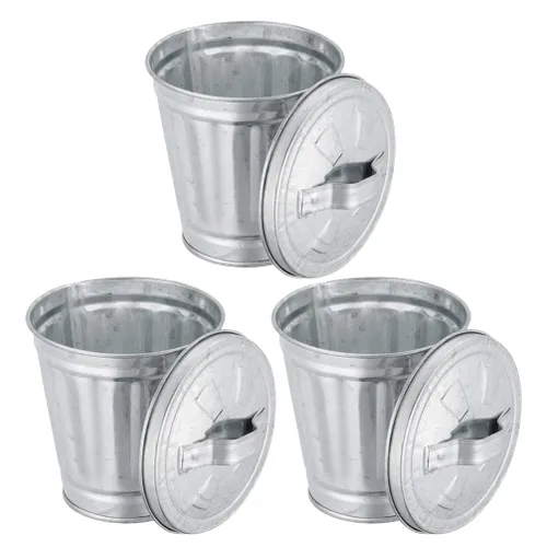 Descripción Bote de basura de escritorio Macetas Mini bote de basura contenedor de basura maceta con tapas Características - Color: Plata. - Material: Hierro. - Tamaño: 9.50X9.00X9.0.0 in El paquete incluye: 3 botes de basura pequeños de metal con tapas