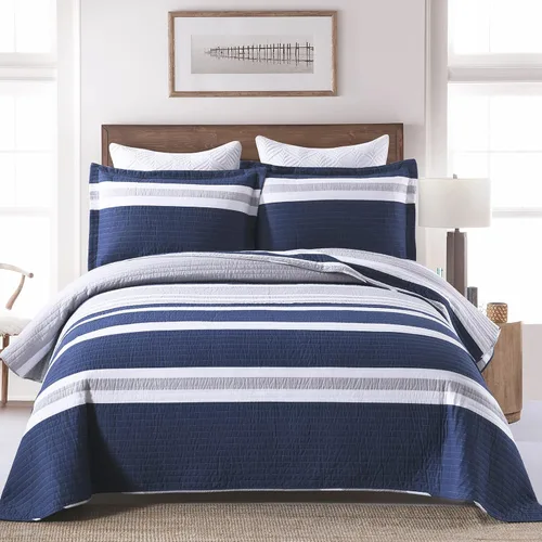 SahSahCasa Juego de edredón tamaño King, 100% algodón, edredón azul marino, juego de ropa de cama King, edredón reversible ligero a rayas para cama
