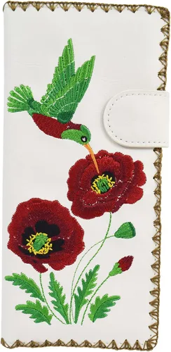 Skelapparel Cartera plana grande de piel sintética bordada con diseño de colibrí y amapola, Blanco, Cartera