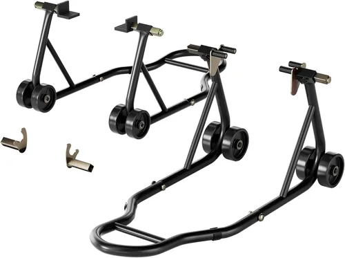 MATERIALES PREMIUM - Con un marco de metal robusto, nuestro soporte de motocicleta garantiza una estructura sólida y duradera; Construido con acero de alta calidad y un acabado con recubrimiento en polvo negro, cuenta con propiedades antioxidantes, asegurando una vida útil de uso confiable; El combo de soporte de rueda delantera y trasera no solo es conveniente, sino que también está construido para soportar condiciones difíciles, proporcionándote una herramienta segura y confiable para manipular tu motocicleta CABECERAS DE HORQUILLA AJUSTABLES - El soporte frontal con dobles cabezas de horquilla ofrece un amplio rango de ajuste de 9–12.2 pulgadas; El soporte trasero presenta un soporte de horquilla en forma de U que se puede ajustar de 11.2–14.4 pulgadas; Además, se proporcionan dos cabezas de horquilla en forma de L con un rango de ajuste de 10.2–13.6 pulgadas; Estas opciones versátiles aseguran un soporte sólido en todos los lados de tu motocicleta; Verifica la compatibilidad de la motocicleta antes de comprar, recomendamos usar tornillos de soporte coincidentes para un ajuste óptimo FIABLE Y ESTABLE - Con una robusta capacidad de 441 libras. Capacidad cada una, nuestro elevador trasero de motocicleta proporciona un soporte estable y seguro para levantar tanto las ruedas delanteras como traseras durante las tareas de mantenimiento y reparación; la estructura triangular garantiza un apoyo equilibrado, mientras que las almohadillas inferiores antideslizantes reducen significativamente la posibilidad de deslizamiento y abrasión, asegurando una experiencia de elevación segura y confiable MONTAJE Y OPERACIÓN FÁCIL - El soporte para ruedas de motocicleta está diseñado para un montaje sin esfuerzo con accesorios y piezas mínimas, tomando solo unos pocos minutos; Equipado con 4 ruedas giratorias, maniobrar el vehículo se vuelve muy fácil, ahorrando esfuerzo innecesario; Su superficie lisa facilita la limpieza con un paño húmedo, asegurando una experiencia de mantenimiento sin complicaciones MULTIPLES USOS - El soporte de elevación de rueda delantera y trasera para motocicletas es versátil y se puede usar juntos o por separado; Proporciona un soporte esencial, facilita la limpieza y el mantenimiento de las motos en casa o en talleres; Compatible con todas las motos deportivas con ancho ajustable, puede levantar modelos de Honda, Kawasaki, Suzuki y Yamaha, ofreciendo una solución integral para varios tipos de motocicletas; Por favor, ten en cuenta que si no has recibido las cabezas de horquilla U o L actualizadas, contáctanos rápidamente