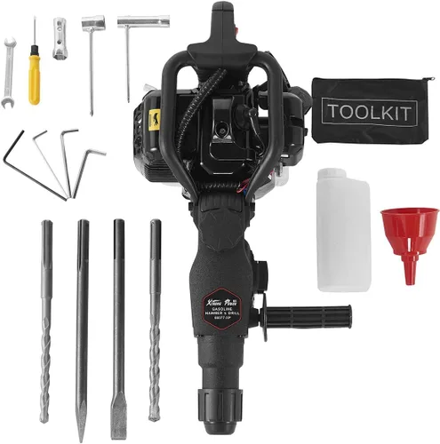 XtremepowerUS El martillo es adecuado para el hogar y los negocios, perfecto para demolición, zanjas, astillado, romper agujeros en hormigón, bloque, ladrillo, estuco de azulejos, quitar una base, losa de hormigón, chimenea de aceite y mucho más Martillo de demolición de gasolina multifunción 2 en 1 para taladro y cincel La tira delantera ajustable de 360 grados proporciona un control adicional que hace que sea fácil de ajustar cómodamente en función del posicionamiento que necesitas para el trabajo a mano El botón de bloqueo del gatillo permite un funcionamiento continuo sin sostener el gatillo Alimentado por motor de 2 tiempos, cumple con los estándares de certificación EPA y Carb